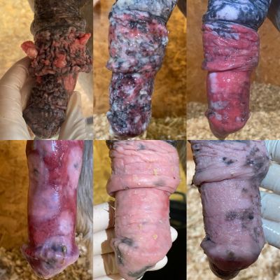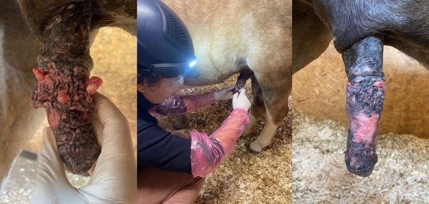 During a closer examination, and following a sheath clean performed under sedation, Jess discovered multiple masses on the body of Doug’s penis. These lesions had the typical appearance of squamous cell carcinoma, a type of cancerous tumour that can affect this area in horses.