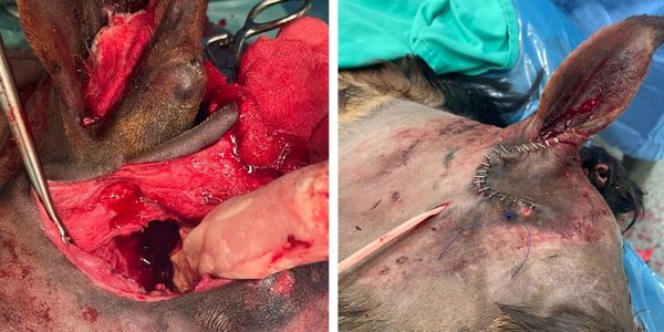 A case study of a dentigerous cyst. Two teeth which had taken a wrong turn and lodged near the horses skull under the ear.